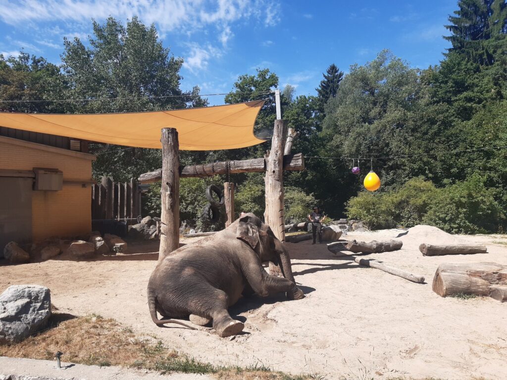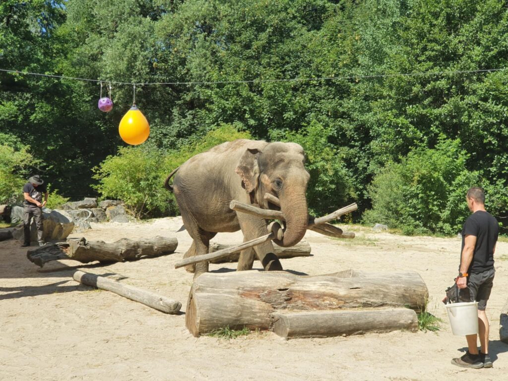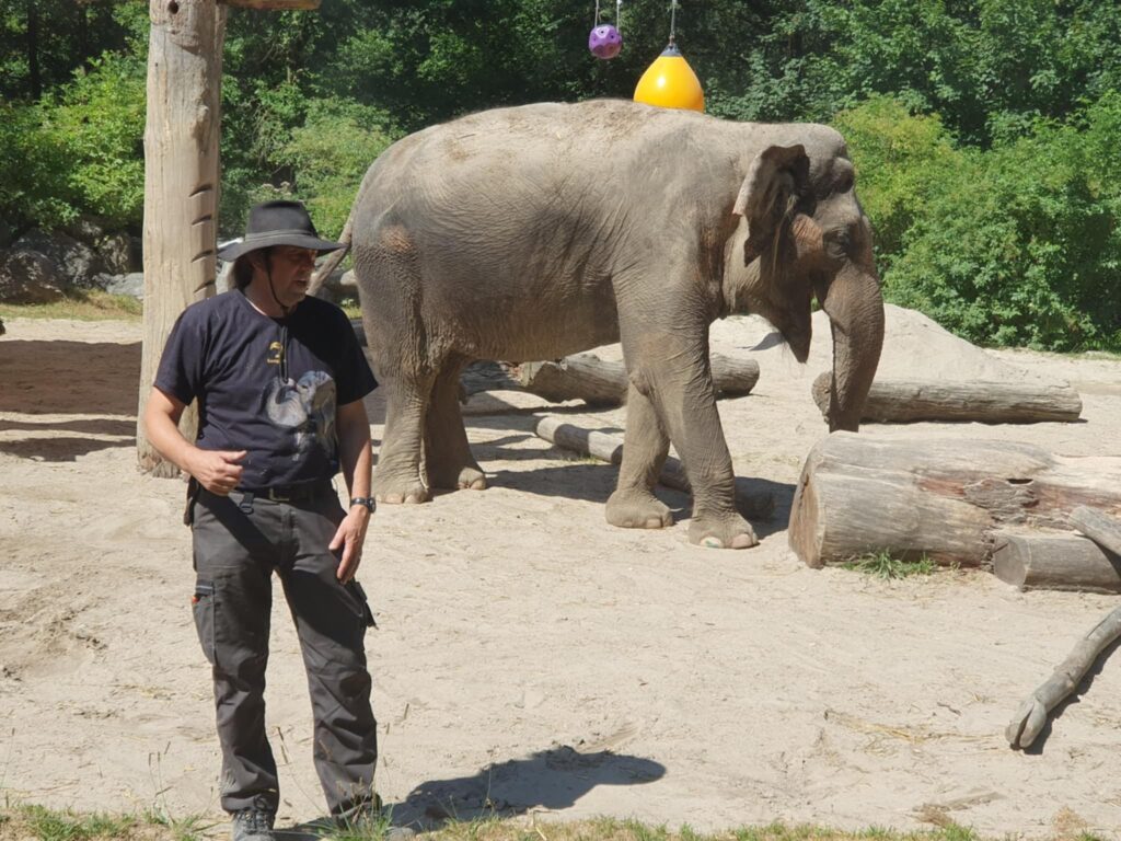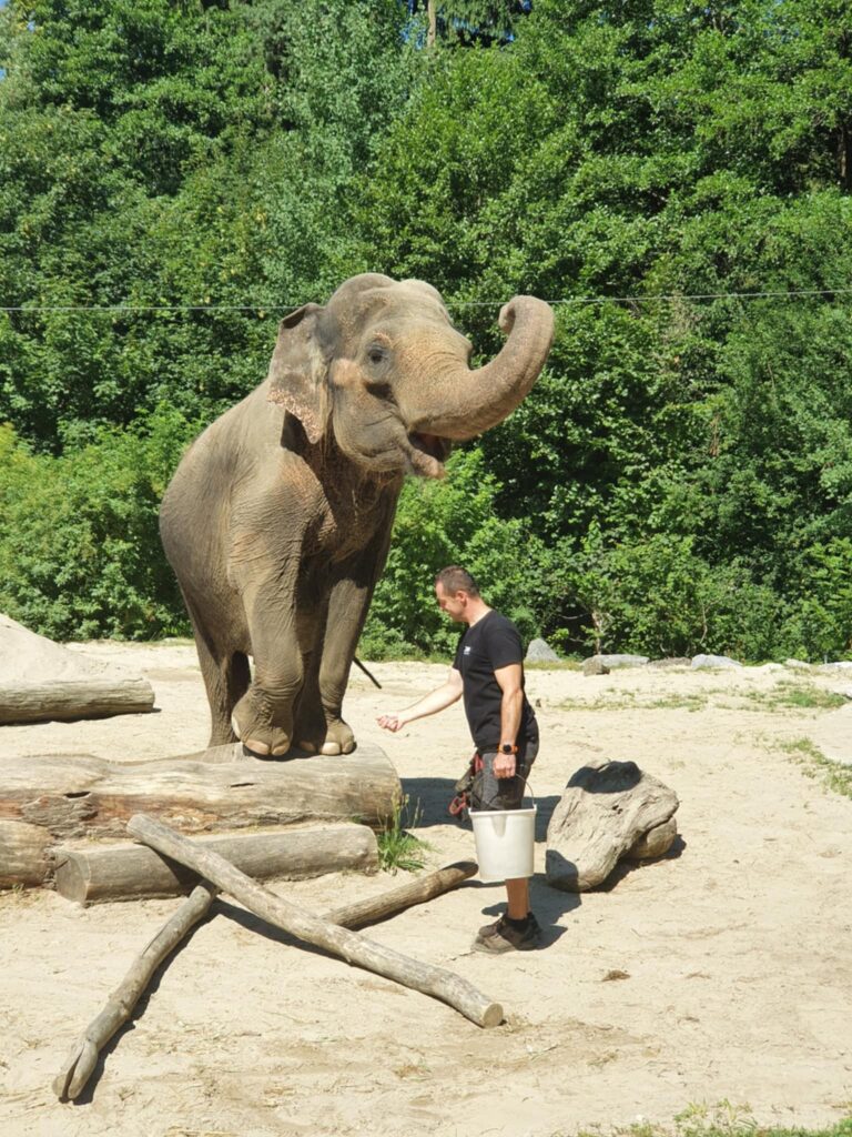 Julijsko delavnico skupinskega družabništva smo iz Švicarije prestavili v družbo plemenitih živali, ki že vrsto let živijo v Živalskem vrtu Ljubljana. Z vnemo smo se pridružili praznovanju abrahama azijske slonice Gange, ki je resničen dokaz, da so živali visoko čuteča, dojemljiva in inteligentna živa bitja. Pod budnim in zavzetim očesom oskrbnikov je Ganga pokazala svojo dnevno rutino in kako usklajeno sodeluje v bližini človeka in izvede kakšen trik. O veličastnosti 3,5 tonske gospe govorijo dejstva, da spi le do 4 ure dnevno, poje veliko sena in pšeničnih otrobov, no tudi kakšnega sadja se ne brani. Izpod njenih 4 močnih zob še zlasti hitro izgine lubenica. Zelo rada se posuje s peskom, da se zavaruje pred mrčesom in žgočim soncem.